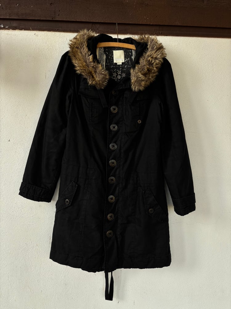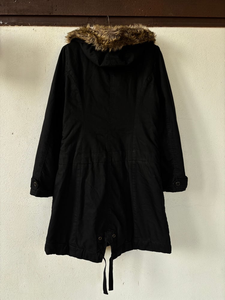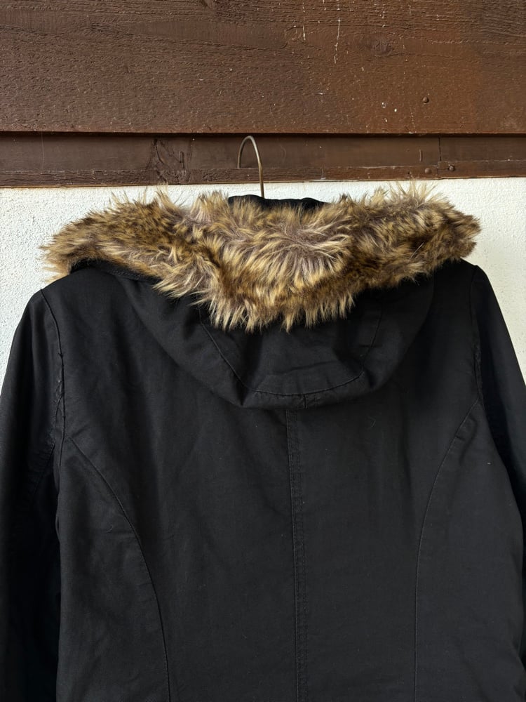 Black nylon with leather details, removable faux fur hood and removable wool liner