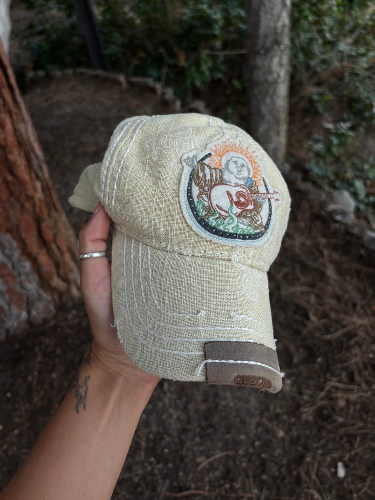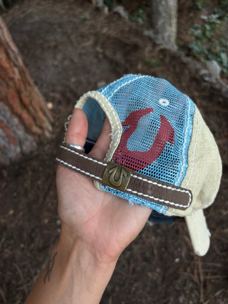Vintage 00s True Religion ‘Big Buddha’ trucker hat with leather details