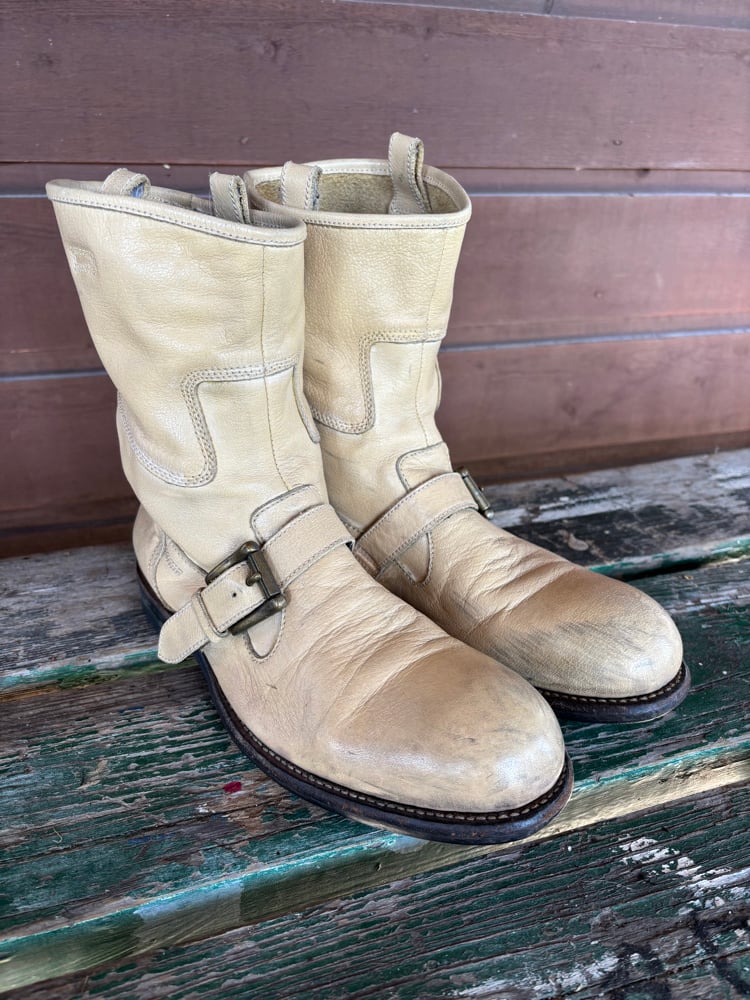 Alfredo Bannister engineer bootsBeige leather with brass bucklesVibram soulSome scuffs on leather, see photosMade in JapanSize 40