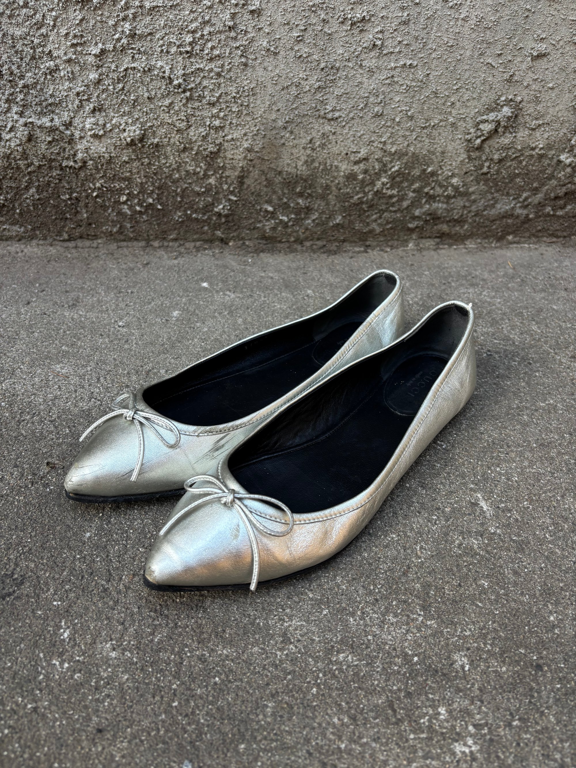 Gucci pointed toe metallic silver ballet flats with bows