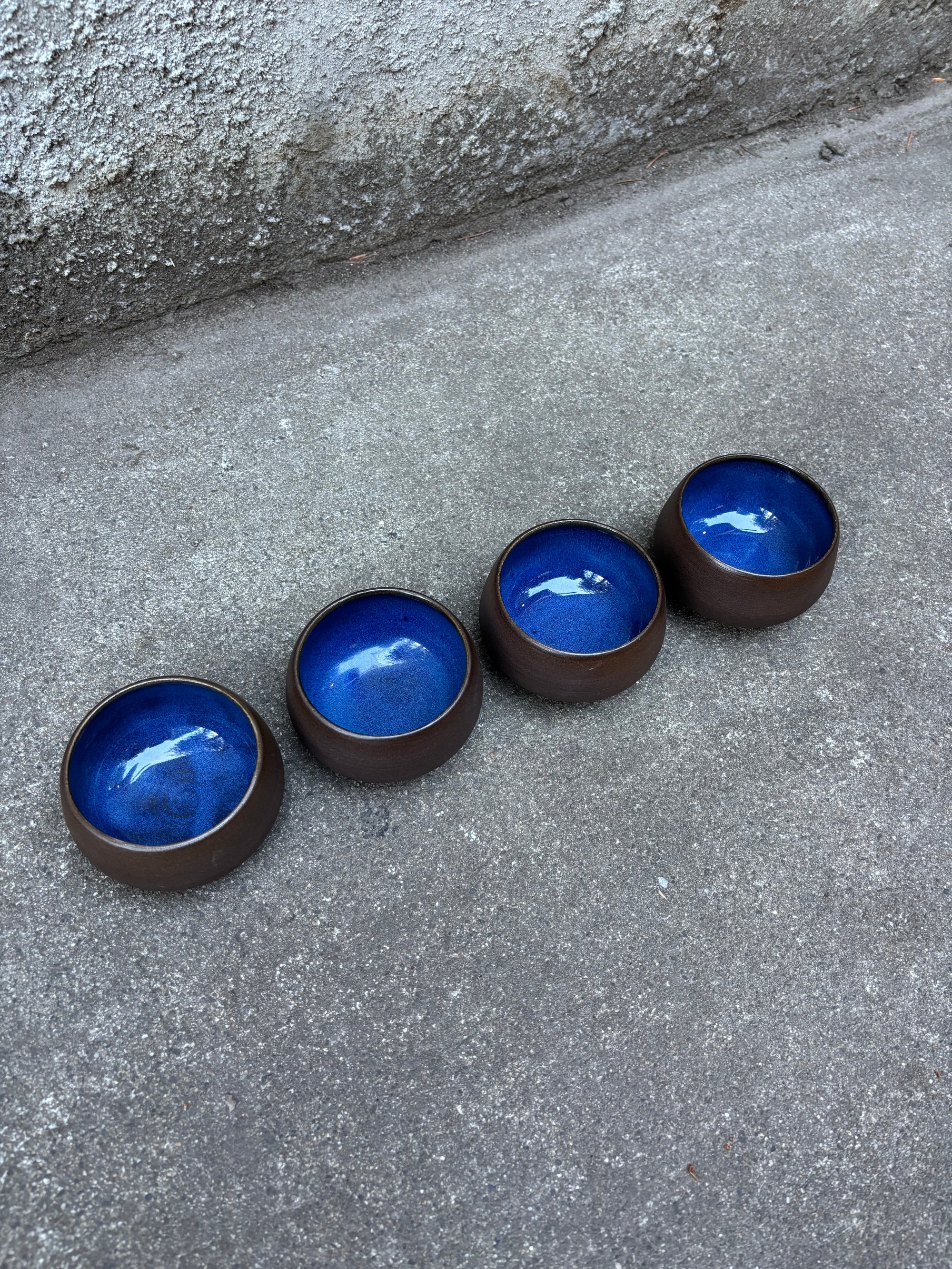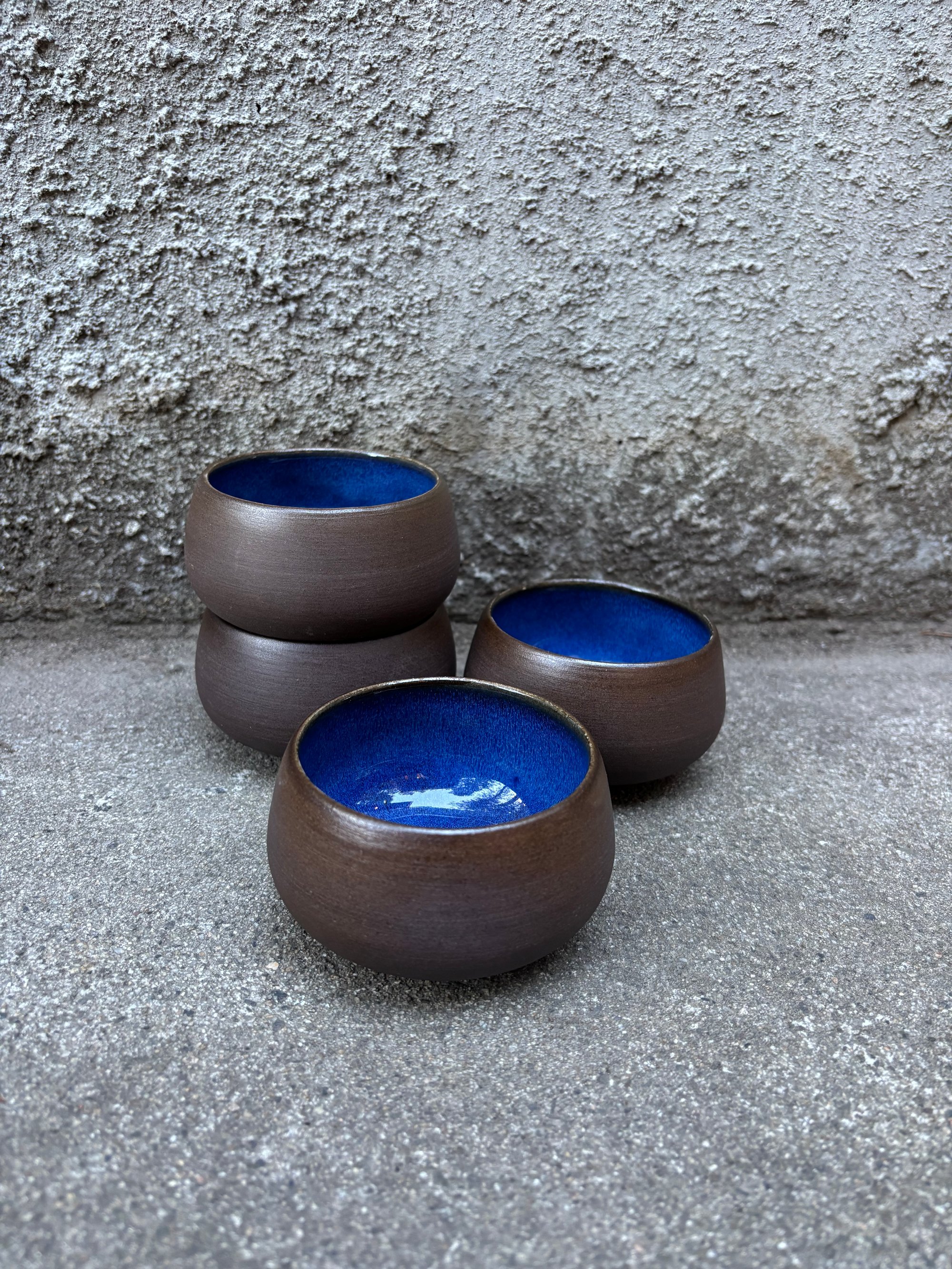 Dark brown ceramic tea cups with indigo glaze